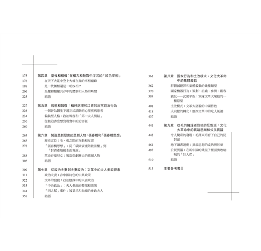本書還對文革中浮現的一些特殊的歷史現象,比如集體大屠殺、夫人參政、異端思潮和政治異議者的興起做橫截面式的分析。理論框架和研究方法並沒有畫地爲牢在政治心理學的單一的領域內,而是盡可能地海納百川、有容爲大。