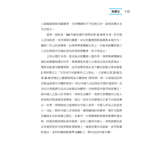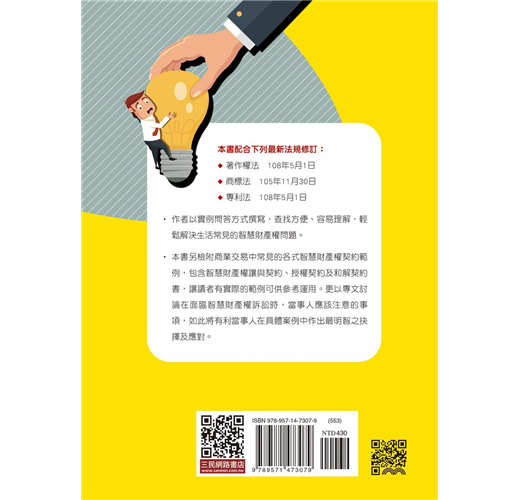 3.本書另檢附商業交易中常見的各式智慧財產權契約範例,包含智慧財產權的讓與契約、授權契約及和解契約書,讓讀者有實際範例可供參考運用。更以專文討論在面臨智慧財產權官司時,原告或被告應注意之事項,如此將有利當事人於具體案例中作出最明智之抉擇。