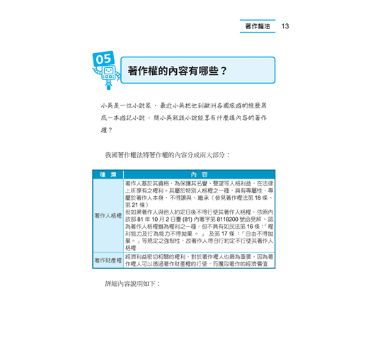 2.作者以實例問答方式撰寫,查找方便、容易理解,輕鬆解決生活常見的智慧財產權問題。