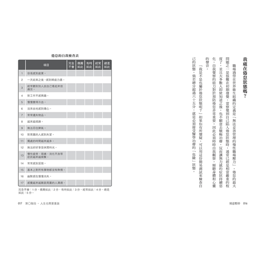 不過,我們偶爾會出現身體和心靈什麼都不想做,也沒有任何欲望的一瞬間。因爲飽受過度疲累和無力感折磨,開始產生自我厭惡,這就是「倦怠」(burnout)。這個單詞也可以解釋成「職業過勞」、「燃燒殆盡」或「精疲力竭」。耗盡了體內所有能量的人,不得...
