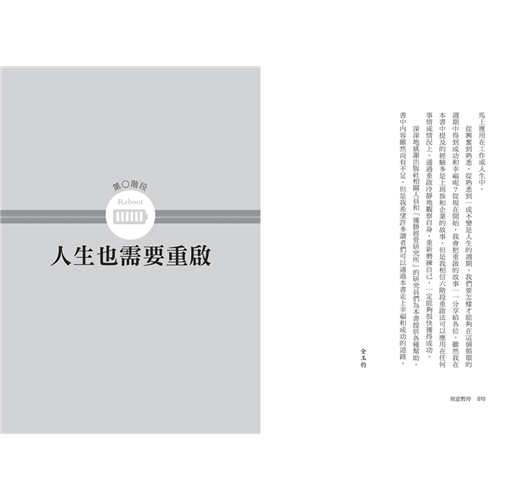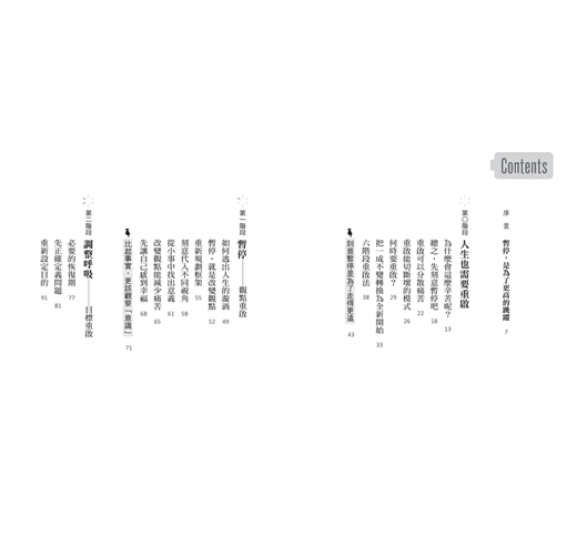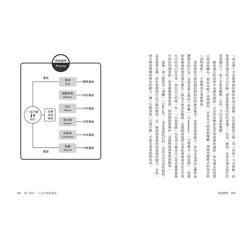 我想跟讀者們分享如何鼓起勇氣獲得新能量的技巧和進一步跳躍和成長的祕訣,因此我把長久以來的研究和經驗集合成這本書。這本書通過「六階段重啟法」:暫停、調整呼吸、定位、再出發、貫徹、飛躍。我會在之後篇章中詳細說明重啟的過程,幫助大家馬上應用在工作或人生中。