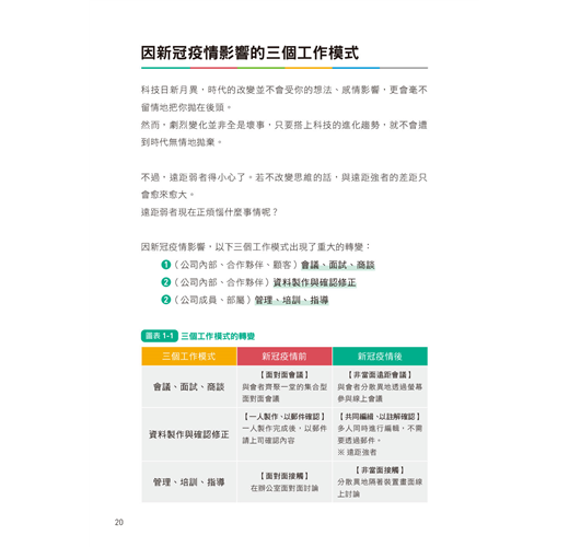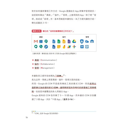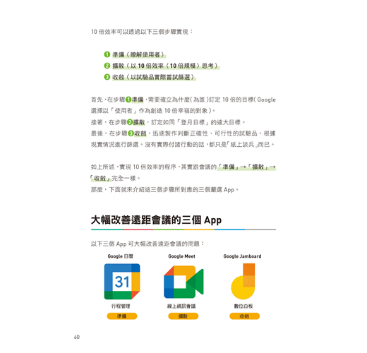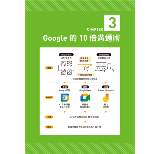 使用Google日曆的Google AI自動調整會議日程;使用Google Meet的即時通訊功能稱霸遠距會議;使用Google Jamboard收斂會議結論。