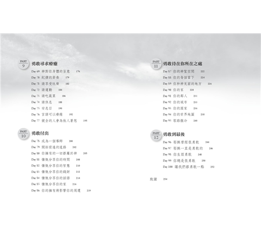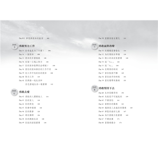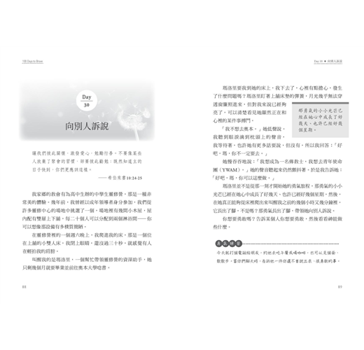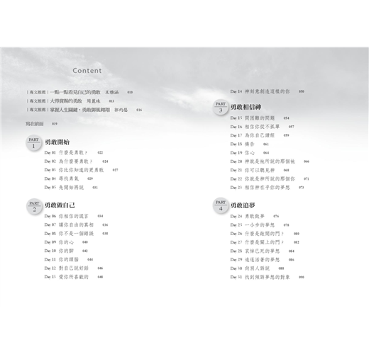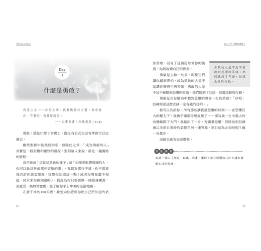 我希望你手邊有一本日記,或者會去買一本日記,一起來撰寫有關自己每一天生活裡的故事。這100 天的紀錄對我來說很特別,希望對你也一樣。我整理了一些自己最喜歡的、關於勇氣和膽識的想法,並將它們與過去幾年來神、生命和人們教給我的許多新的想法融匯在一起,我想,當這些與你自己的生活、與神為你所做的一切結合,對你而言可能會是一段非常有趣的旅程。