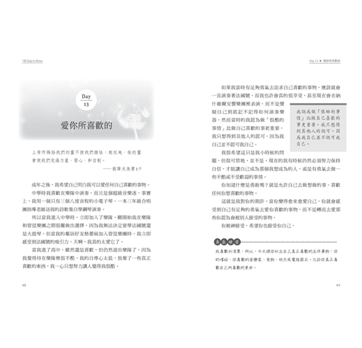 名人推薦:在100天當中,一點一點的看見自己的勇敢,一點一點的學會做自己,成為天父眼中那個美好的你。──王雅涵,諮商心理師