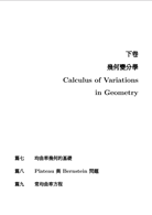 幾何變分學中很多經典的idea與貢獻,則為下卷探討的主題,例如:Laplace的毛細估計、Plateau問題、Bernstein問題、迷人的Hopf猜想、與凸性問題等。