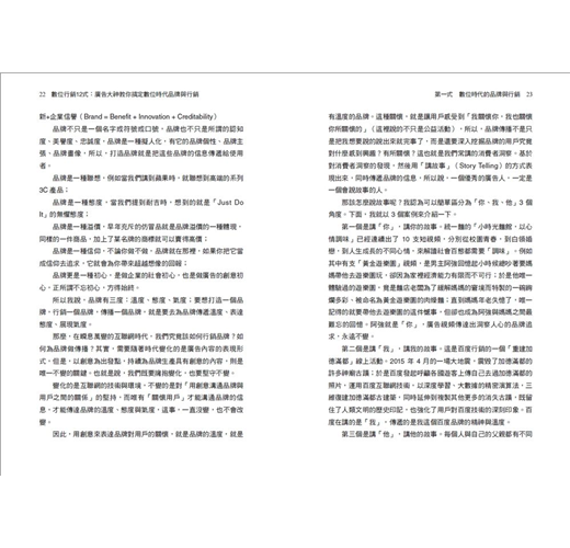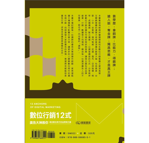 本書集結海峽兩岸暨國際級知名數位行銷集團之資深高管、互聯網媒體的運營大佬與資深廣告創意大咖,包括奧美、谷歌、小米、安索帕、偉門智威、宏盟、雪芃、亞洲指標、格帝、虎嘯傳媒、聖火傳媒……以課堂講座的方式,分享兩岸對數位行銷及廣告市場的現狀與發展,講授主題包括品牌、創意、行銷、數據等不同領域,藉由每一位資深廣告人的不同專業,組合成一門完整的「課程」。