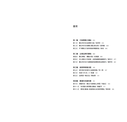 坊間雖然已有許多關於數位行銷的專書,但我們對此書非常有自信,畢竟其是跨兩岸的觀點,更是知名廣告行銷實務界頂尖人士所合著的寶典,而一本書能集結這麼多知名度極高的廣告行銷大神數十年的功力及心法,自屬難能可貴、千載難逢,更是本書與其他書籍全然區隔之處。當然我們也希望藉此本書,更進一步地普及數位行銷的專業知識,讓數位行銷的實務技巧更能深入數位時代的生活領域,進一步為品牌、產業、行銷實務工作者、學術研究者及相關各領域創造更具體實用的亮麗成果。