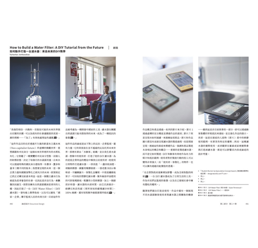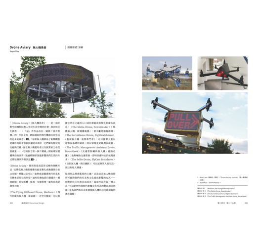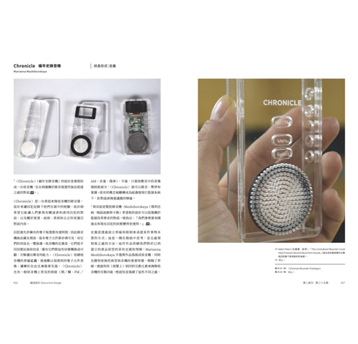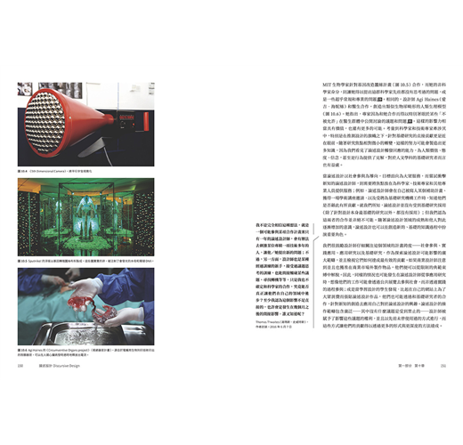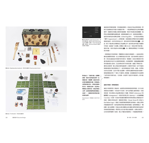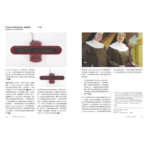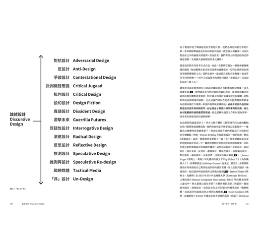 因此你將看到,作者將二十多年不同領域實戰經驗,與論述設計於各個應用層面的價值見證加以融合,所企圖開展的磅礴架構:從歷史縱深循序漸進,溯及九0年代中期Anthony Dunne(安東尼.鄧恩)與 Fiona Raby(費歐娜.拉比)受矚目的「批判設計」,勾勒另類、設幻、推測、對抗等類型的理論與創作,將之比較出「什麼是論述設計?」的探討式推進,如何用人類學、社會學的視野去理解設計物件,扎實說明作品如何以inspire(啟迪)、inform(告知)、remind(提醒)、persuade(說服)、provoke(激發)為實踐目標。並反之詰問:「什麼不是論述設計?」當「每一件物品都是論述的,它可以促使人談論」,其中「人」所隱含情緒與多元的變異角色,是否正為此一領域平添富於抽絲剝繭的探索趣味!?