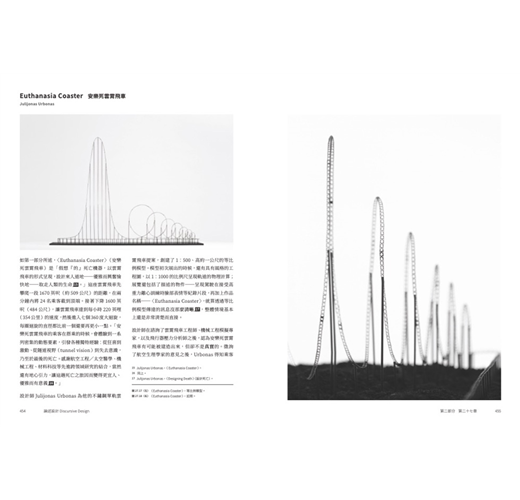 ★論述設計激發討論功能,在這種通常顯得死板的情況下,可以化身為獨特而有力量的工具,那麼,雖然〈Euthanasia Coaster〉(安樂死雲霄飛車)(一台「以雲霄飛車為形式的死亡機器,旨在人道地——優雅且安樂地——奪走人類性命」)並不是「在世凡人計畫」的一部分,但它能否作為賦予人靈感的裝置,協助患了絕症的丈夫和他的太太,開啟一段兩人之間的困難對話(圖10.3)?針對這件作品潛在嚴肅性異想天開的理解,能否讓對話變得更容易一些?這項計畫能否成為醫生或諮商師的實用工具,協助他們促進病患計劃生命臨終情境的目標?