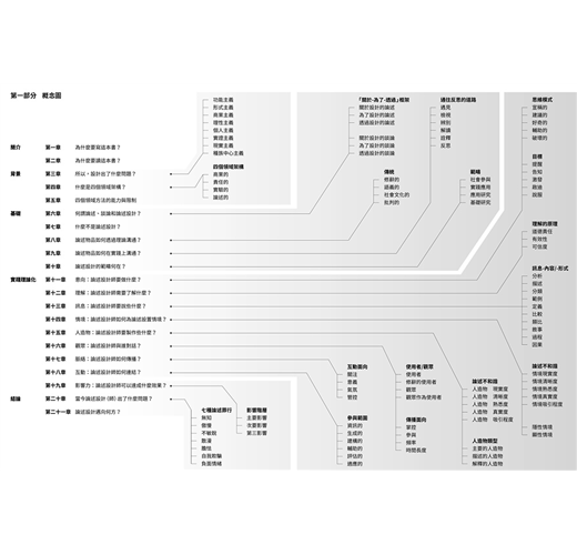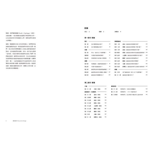 第一部分的論述設計:理論,提供了論述設計本身、以及當中不同層面的細節論點。第二部分的論述設計:實踐,則會透過更多的例子以及案例研究,來重溫並且強調第一部分所提出的概念。藉由針對最重要的概念和詞彙,提供簡明扼要而平易近人的介紹;第二部分同時也提供了一個良好的起始點,可以在開始一項新作品時作為快速的參考。最終,實踐和理論對於有根據的、有效率而多元的設計行為而言都無比重要,因此本書的這兩個部分是彼此合作的。