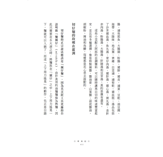 「如果有朋友問我台北哪間切仔麵好吃的話,我會和他們說:『去蘆洲吃吧,過個台北橋,切仔麵一下就提高了好幾個層次。』」〈切仔麵──最普及的古早味〉
