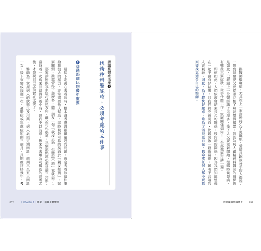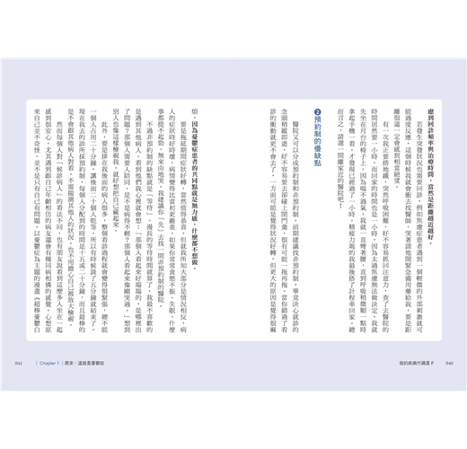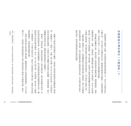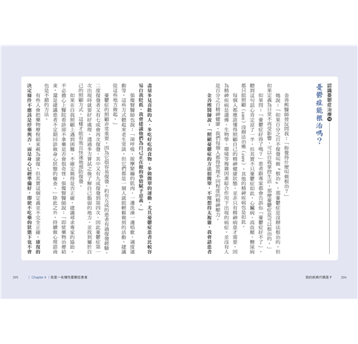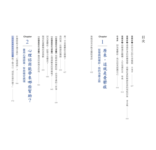 很高興這本書能出版,一直以來我和團隊致力於消除社會對精神科、精神科疾患、藥物治療的刻板印象,但總有一堵翻不過去的牆——人們對精神科醫師的不信任。即使我們用再怎麼多的實際臨床案例去說服病人,他們大部分還是會說:「你會這麼講是因為你是醫生,不是病人。」因此我一直盼望著有病人願意站出來勇敢分享自己的故事。