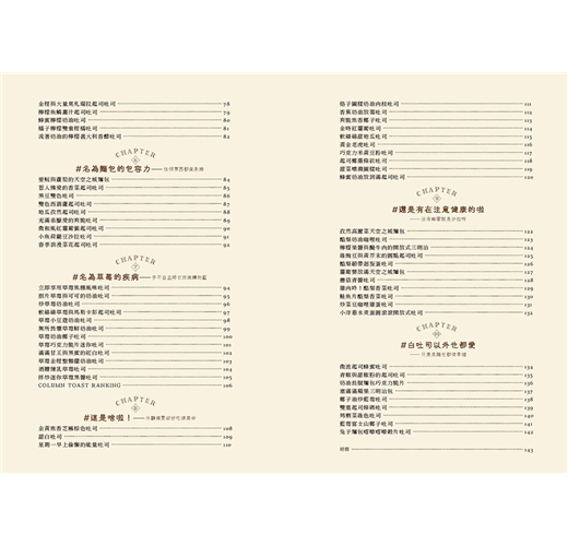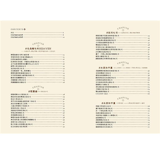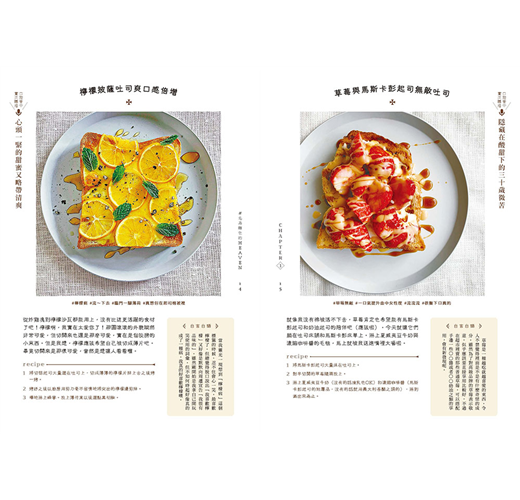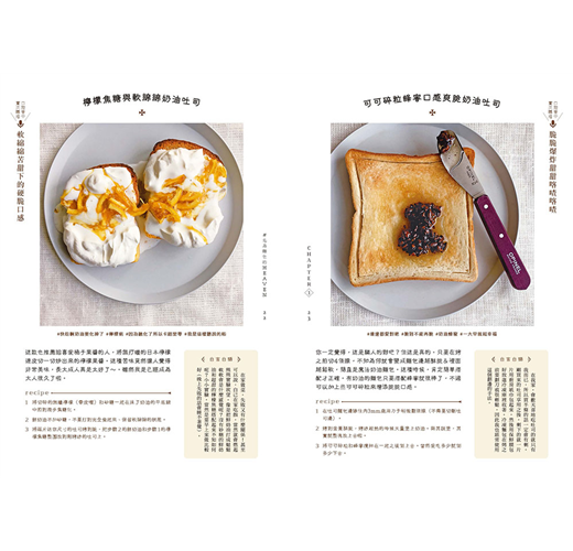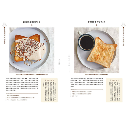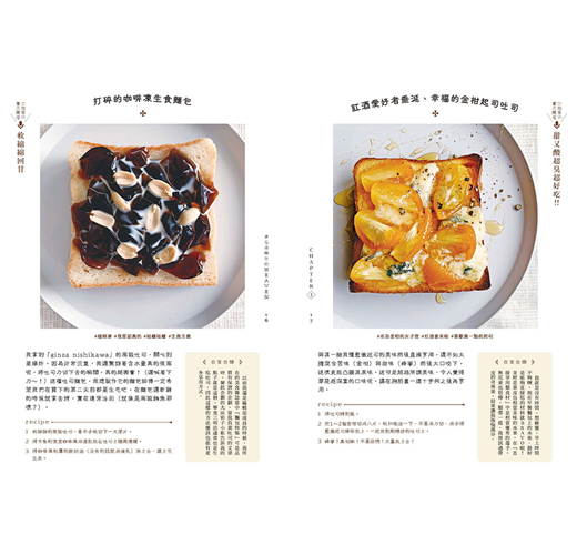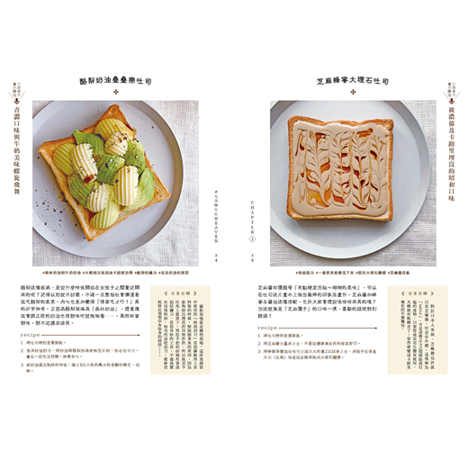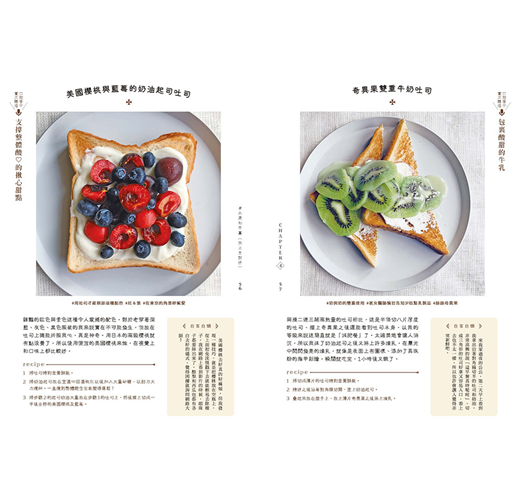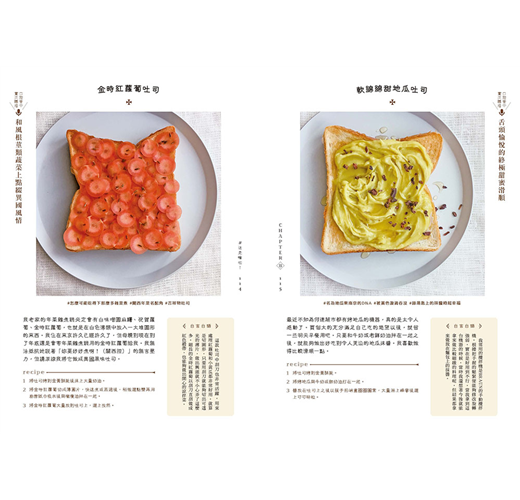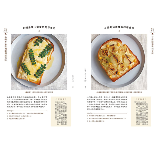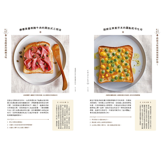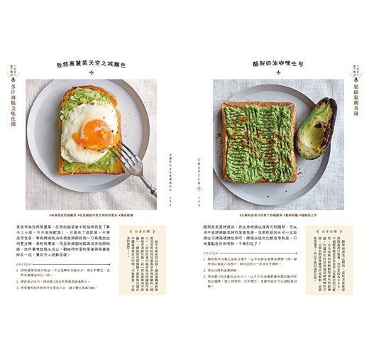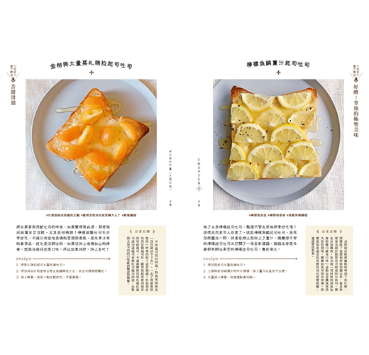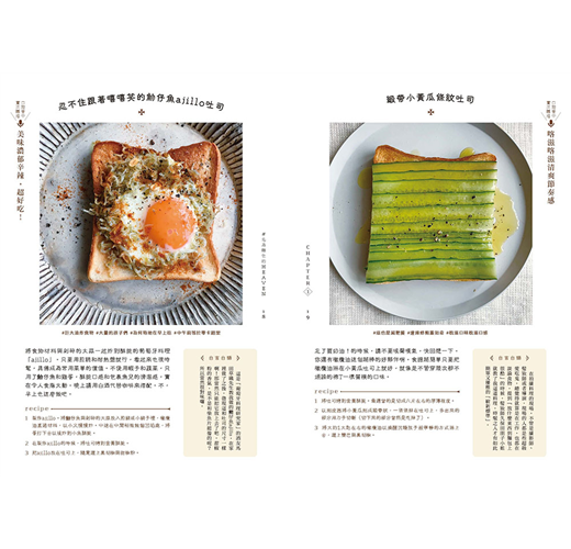 開篇就先來個震撼教育,檸檬披薩吐司、生乳酪蛋糕風吐司、酪梨奶油疊疊樂吐司、甜又酸超臭還讓人想配紅酒的金柑起司吐司……哇咧,懶人吃個吐司也這麼奢侈,後面幾章要怎麼看下去啦!