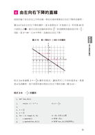 「本書所討論的數學式為「y = ax + b」,也就是以「直線」為主。有些人聽了可能會很驚訝「只有直線?」但無論是數學還是程式設計,我都建議先從可以在腦海中輕鬆想像的簡單主題開始學習。各種不同的直線可以用什麼樣的數學式子來表示呢?如果改變了那個數學式的一部分,直線又會怎麼變化?