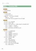 Chapter 3:GPIO ,介紹如何在核心中使用 GPIO 。有了 GPIO 之後,就能在 Chapter 4:IRQ 中使用 GPIO 觸發各種 IRQ,搭配 Chapter 1 的動態追蹤工具,讓讀者可以親自實驗中斷上半部與下半部機制的執行機制、執行前後文、發生時機等等。本書涵蓋的下半部機制包含了 workqueue、softirq、tasklet 與 threaded IRQ。在理解 IRQ 之後,相信讀者在閱讀核心文件時,碰到如「該函式無法在不能休眠的情境使用」之類的敘述時,就不會容易感到困惑。