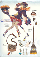 因為是武術家,護胸與手臂部分的裝備比較堅固,並且為整體的設計加上了舞者的元素。主色調是深褐色、黑色與粉紅色。