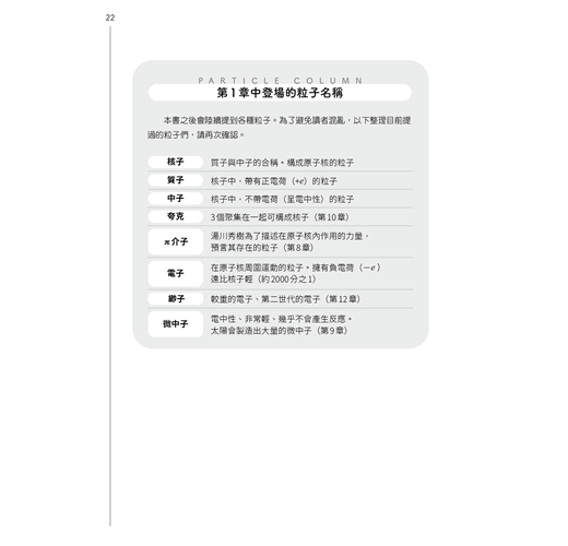 這是一本基本粒子物理學的解說書,同時也是其歷史的解說書。我會在極力避免寫出數學式的情況下,盡可能地描述前因後果。所以說,本文中常會出現各粒子的質量(重量)等數值。從這個角度來看,本書也可以說是一本教科書般的書籍。希望各位能在閱讀本書、動腦思考的過程中,明白到書中提到的原理。