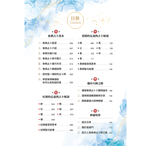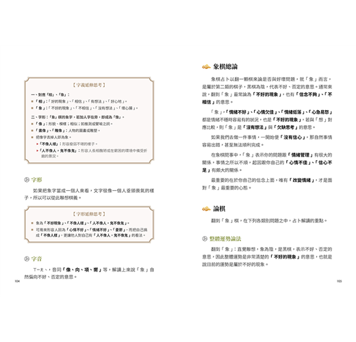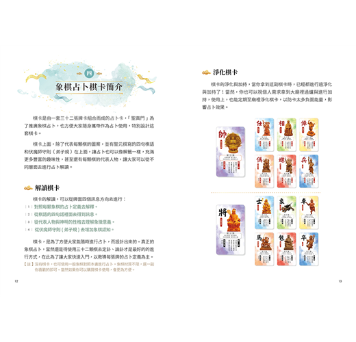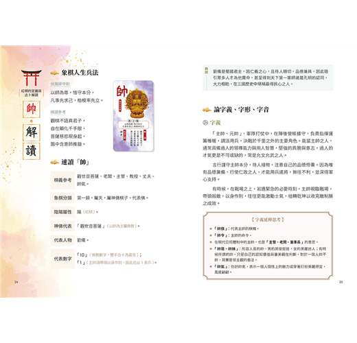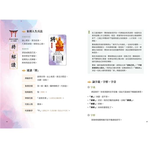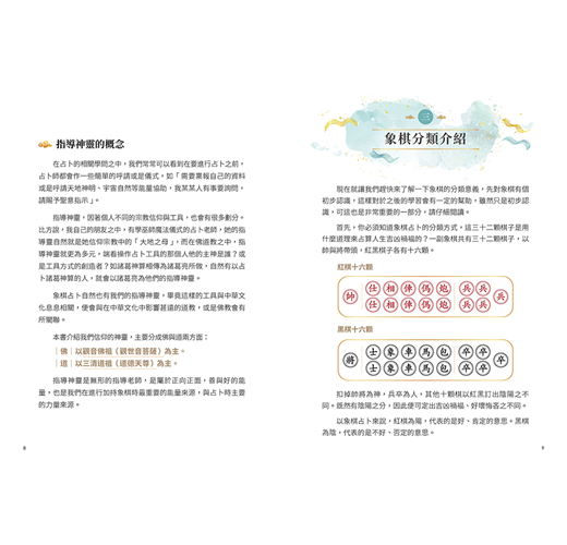 每顆象棋都有自己的定義和象徵的道理,象棋占卜是運用象棋的定義進行占卜及解讀。而書中運用字音、字形、字義三方面分析文字結構,讓你能更精準掌握棋義。