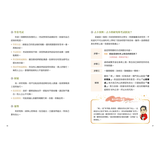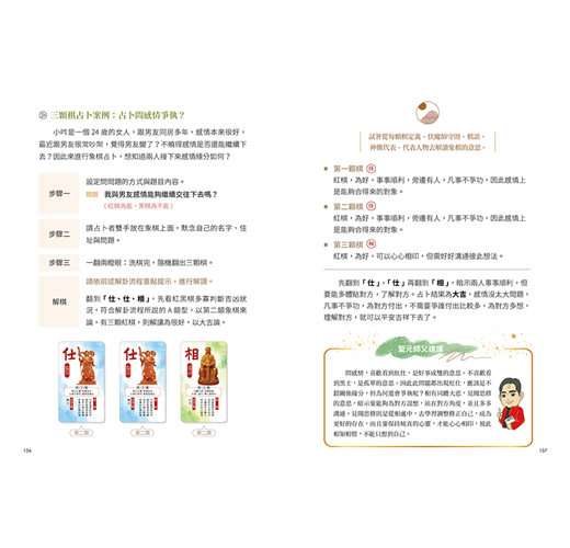 只要能理解14顆象棋的基本代表意義,再學習從事業、感情等各方面理解,當翻到該顆象棋時該如何解釋,跟著書中步步前進,就能輕鬆上手!