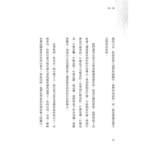 在學校時,你坐在一張小椅子上,把注意力放在老師所教的科目上。在教堂內,你把注意力放在神父或牧師所講的道理上。你的父母、兄弟、姊妹也都試圖要抓住你的注意力;與此同時,我們也學會如何博取他人的關注。漸漸的,我們愈來愈需要別人注意我們,而這樣的需求,有可能會導致我們與他人進行激烈的競爭。兒童會競相博取父母、老師或同儕的關注。「看看我!看我在做什麼!喂,我在這裡!」這樣的需求會變得愈來愈強烈,並持續到成年以後。