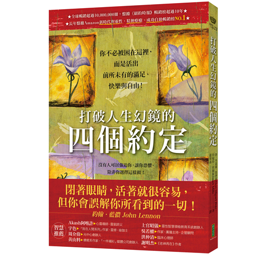 作者為我們透析了這人世間的幻鏡,教我們明白我們是如何成為「自己」,進而看清生命的虛假信念,確定生活中不快樂、甚至恐懼的來源,並提出了四項有益的約定,人們可以通過這些約定,逐步來達成改善個人整體的自由與幸福感。