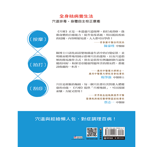 中醫治療是根據人體經絡的走向,五臟六腑的互相調節,使用天然藥草或是經絡療法來促進身體的健康。《穴療》正是一本透過穴道按摩、拍打或刮痧,來達成類似針灸或吃藥的效果,內容輕鬆易讀,人人都可以學會,平日可以簡單按壓某些穴道,啟動身體的自癒能力,提升免疫系統,用以抵抗疾病的侵擾。