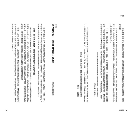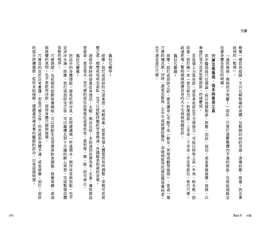 《穴療:對症按摩x拍打x刮痧,小病自己來!》口語化且清楚描述生活中的自覺症狀,並明確而精準地用圖示指導穴位的選取,以及穴道指壓的簡易操作方式,實在是值得有興趣經絡穴道保健的同好,和深受亞健康問題所苦的朋友們,都應該收藏的一本書。