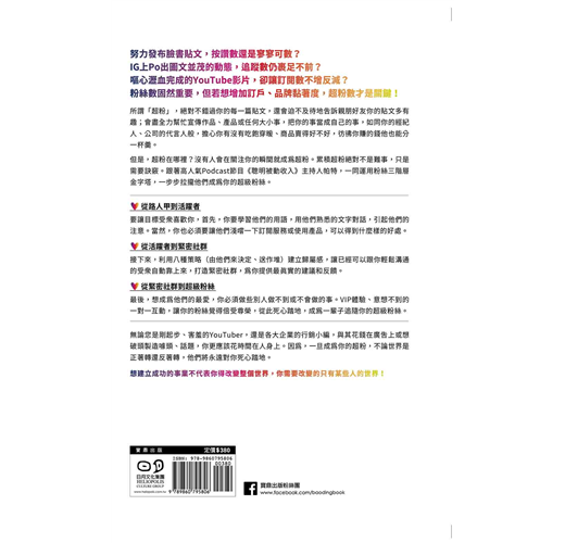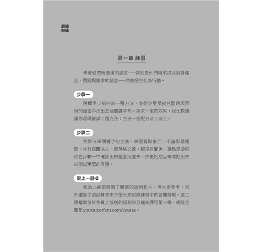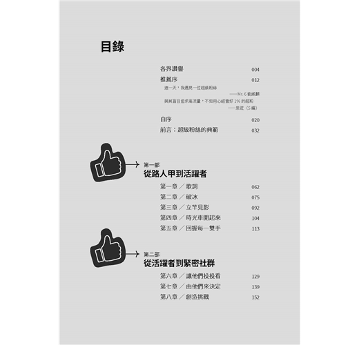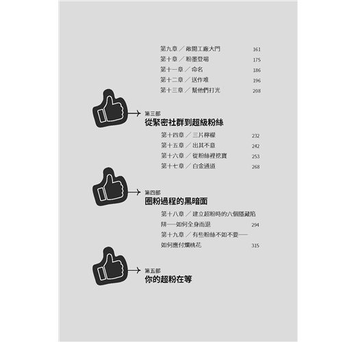 1. 本書分成五大部分、共19章節,除了以循序漸進的方式告訴讀者如何培養粉絲和吸引顧客外,在每個章節的最後都有應用練習,加強實用性。