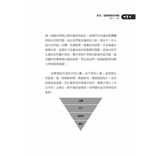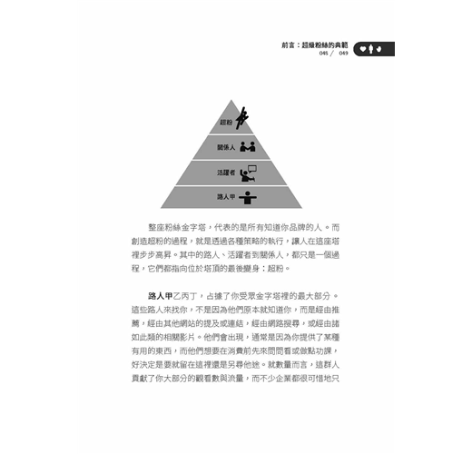 粉絲金字塔會繼續在本書中登場,因為我們需要透過它來探索有哪些策略與戰術可以幫助你,讓你把目標群眾裡的路人撩成真正的超級粉。