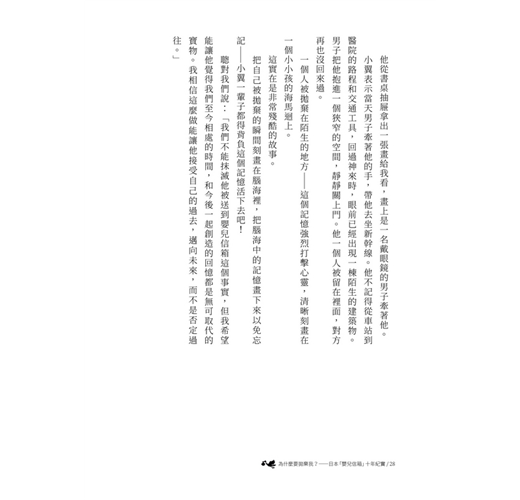 我想大家長大之後,有時會想知道過去的事。生父母要是肯留下一張照片,我們會非常高興,也會很珍惜。和生父母在一起的時間也是人生的一部分,希望能為我們保留「活著的證據」。與養父母的回憶可以之後再打造,但是過去的日子卻不可能重來。所以我希望生父母能為我們留下一點紀錄。