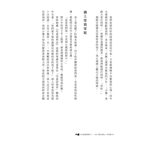 當時距離院方發現小翼已經過了五個月,正是開始認人,也就是會怕生的年紀。他或許察覺到環境發生變化,故意鬧彆扭來試探兩人。然而田中夫妻看到他,打從心底決定要一起保護這個孩子,不能拋下不管。