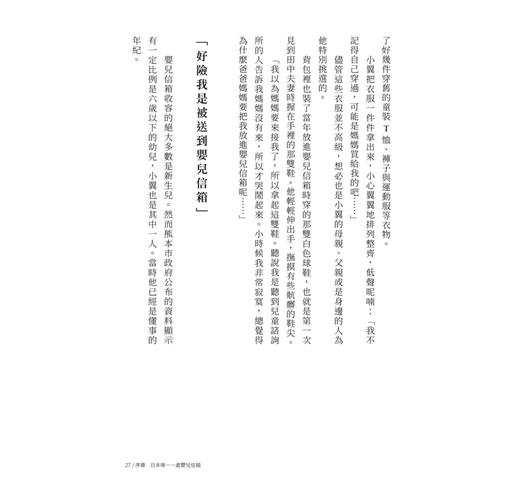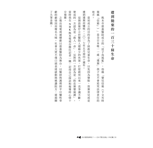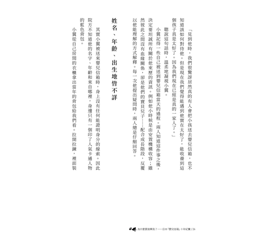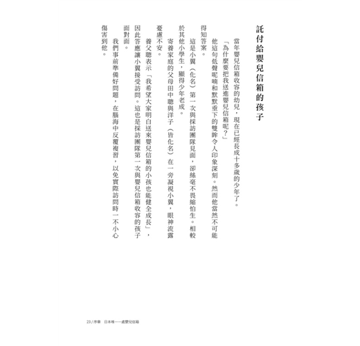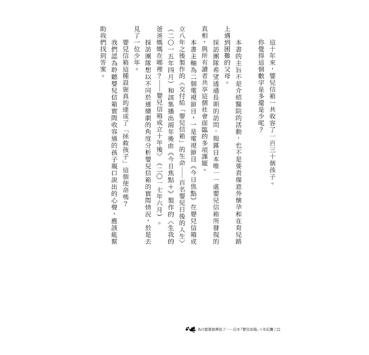 採訪團隊希望透過長期的訪問揭露日本唯一一處嬰兒信箱所發現的真相,與所有讀者共享這個社會面臨的多項課題。