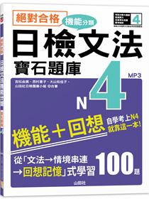 為了紮實對文法的記憶根底,務求對每一文法項目意義明確、清晰掌握。書中還按照時間、目的、可能、程度、條件、授受、助詞、動詞…等不同機能,並以簡要重點文字點破每一文法項目的意義、用法、語感…等的微妙差異,讓您學習不必再「左右為難」,內容扎實卻不艱深,一看就能掌握重點!讓您考試不再「一知半解」,一看題目就能迅速找到答案,一舉拿下高分!