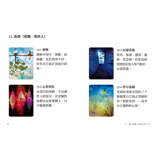 ◎每張牌卡皆有對應的「關鍵字」和「諭言文字」,可幫助使用者經由投射、聯想而與牌卡對話。無論自我探索、一對一、團體互動、工作坊,都能從中得到不同的靈感和啟示,覺察情緒,觸發感受。
