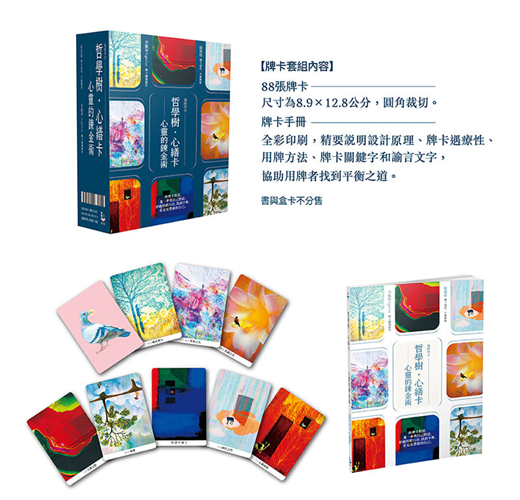 以上22個牌義,即是《哲學樹.心繕卡》的「22組牌義」,每一組會有4張牌卡來詮釋,一共88張,每一張會分別附有一段能引導讀者與圖像對話的諭言文字。