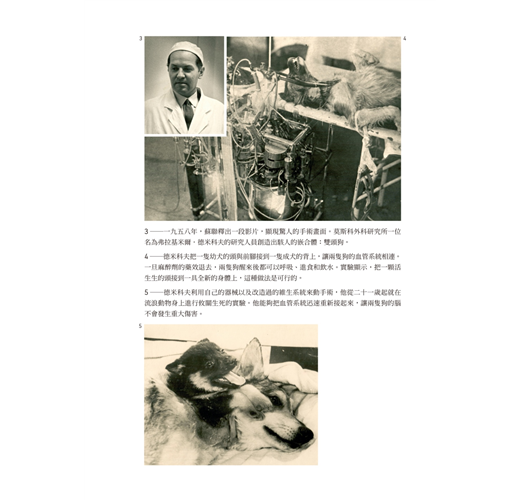 接著來到充滿神奇想法的冷戰時期,太空人約翰.葛倫(John Glenn)離開地球的範圍,英法聯合研製的協和號客機以及蘇聯圖波列夫Tu-144超音速客機翱翔天際,新一代的盜屍者誕生了。蘇聯的鐵幕之後,與身體分開來的器官在悉心保護之下,可以獨立生存,變成鮮為人知的實驗的研究對象。到了一九五○年代,有一些奇怪的黑白影片流到西方世界,揭露了看起來很詭異的東西:在體外存活的心臟、自己獨立擴張的肺、一隻經過手術改造的狗正用相連的兩顆頭舔牛奶……史達林的科學家在各種祕密實驗室中深入探索生命的謎團。他們並非在尋找人類靈魂。做為優秀的世俗共產黨員,他們只對生命感興趣:如何維持生命、如何把生命分離出來、如何創造生命。他們對於控制心智也感興趣。冷戰時期的研究把腦視為一種無線電接收器,會收發電磁訊號。腦如何運作?為什麼腦可以運作?你需要多少分量的腦就能存活?腦死亡而身體卻繼續活著,會是什麼狀況?當角色互換,變成只有身體停機了呢?生命可能免於癌症侵蝕器官造成的逐漸退化、肌肉萎縮症導致的衰弱,或者葛雷克氏症(Lou Gehrig’s disease,俗稱「漸凍症」)引起的肌肉僵硬──只要能把腦移到別處好了。