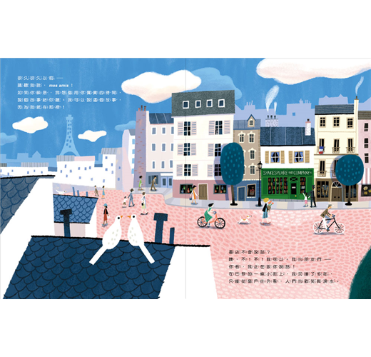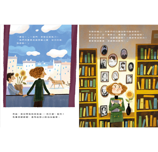 我為七歲的孫女買了這本書作為禮物。她很喜歡書,而且我剛從巴黎莎士比亞書店買了一些書回來!這本書後面有書店的背景,還有故事中出現的文學家和藝術家的介紹,很貼心的設計。──讀者 珍妮佛