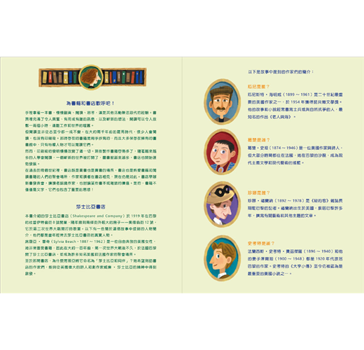 是的,書籍不僅僅是文字,它們也包含了重要的思想。同樣的,書店不僅是書的流通場所,也承載了自由和美好的夢想!書末附有資料性的文字,介紹了「莎士比亞書店」的時空背景,以及書中登場的文學家和藝術家。