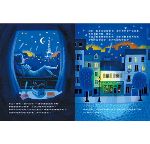 由書店自述,述說巴黎人最愛的「莎士比亞書店」及其創始人的故事。文字充滿神奇、童話般的魔力,與插畫家的印象派風格相得益彰。──學校圖書館期刊