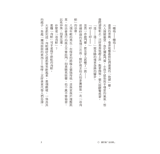 作者巧妙的設計出「缺嘴宏」〈人〉與「竹笛鬼阿泉」兩個主角,選定這項一般人認識的「送肉粽」宗教民俗,透過全書十六個單元,以民間故事方式,分別介紹: