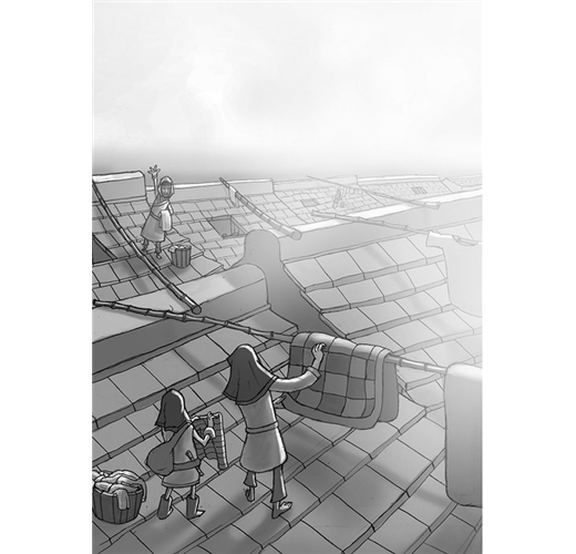 大人探頭張望,急忙關起門窗。小孩子感染到不尋常的氣氛,想發問卻被制止,只好乖乖被趕上床,抱著棉被,張大眼睛警戒著。