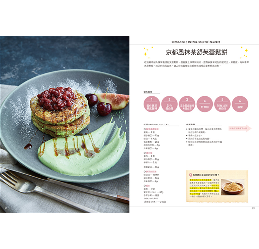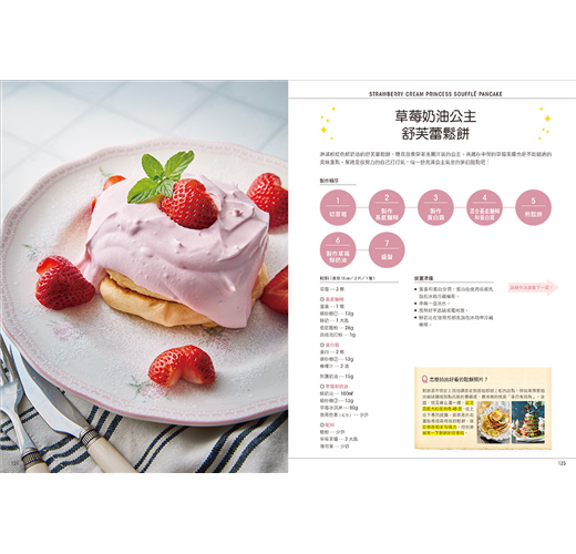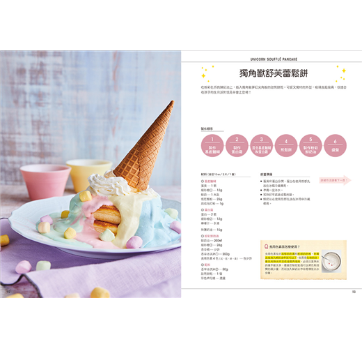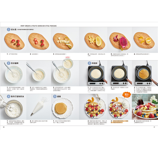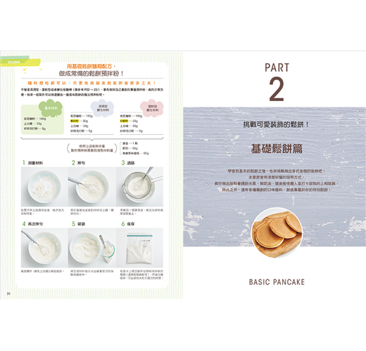 在這本書中包含了就算第一次做也能做得好吃的基礎鬆餅(Basic Pancake),以及在新時代中後起的舒芙蕾鬆餅(Soufflé Pancake)。當然,還有添加了讓人目不轉睛裝飾的夢幻鬆餅。我將多年來的研究、像魔法般的鬆餅作法,全部詳細介紹於這本書裡。在一張張的步驟圖中,到處都是讓美味加倍的「魔法Point」,請千萬不要錯過!