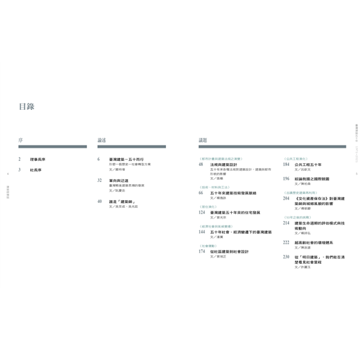 本書主要是以台灣建築五十年為背景,網羅國內知名的建築師和學者專家,探討台灣建築各方面演變,如羅時瑋教授探討台灣社會、經濟五十年來的變革對建築的影響;阮慶岳教授研究台灣建築思潮的演變;吳光庭教授和張樞建築師探討建築師法和建築相關法規的演變;楊逸詠建築師研究技術、材料與工法;曾光宗教授探討居住演化;潘冀建築師探討經濟社會與氣候變遷;曾旭正教授探討社會運動影響台灣建築樣貌等。