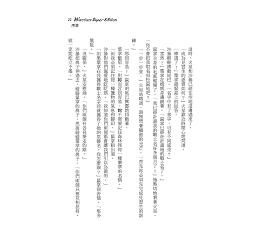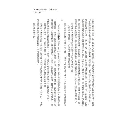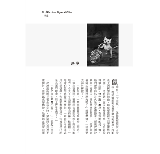 1.首部曲講述冒險精神,二部曲描述愛情與親情的掙扎,三部曲則結合前兩部曲的特色,講述溫暖與黑暗,四部曲接續三部曲未完的情節,敘述貓族歷史,引爆更精采的傳說。五部曲揭開部族的起源與誕生。六部曲迎來失落的部族回歸。外傳系列則是對於貓戰士的正文故事起到了補充作用。荒野手冊帶領讀者深入了解貓族歷史。