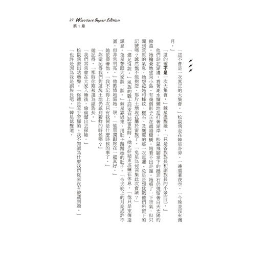 和平的條件是天族再次移居到新領地,就在探查領地時,松鼠飛與葉星發現了一群神祕貓族──姊妹幫。隨著爭鬥越演越烈,部族勢必要奪取姊妹幫的領地,即使不擇手段都要達成!身為雷族副族長的職責與對正直行事的渴望,將松鼠飛夾在中間,進退兩難。