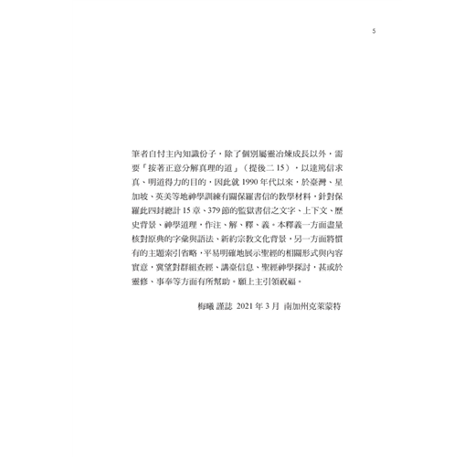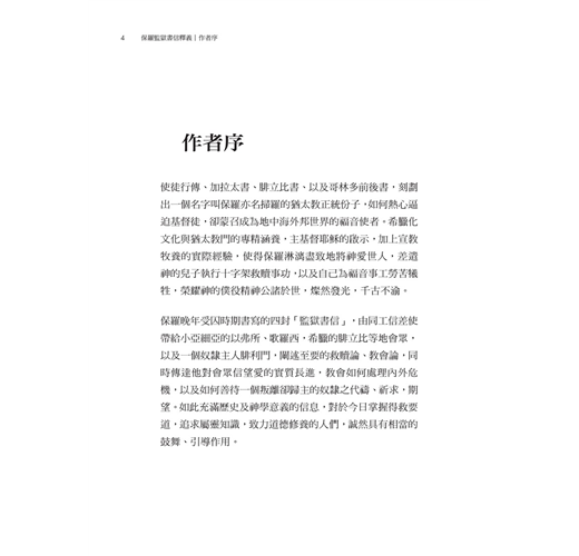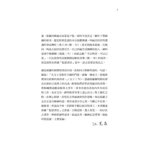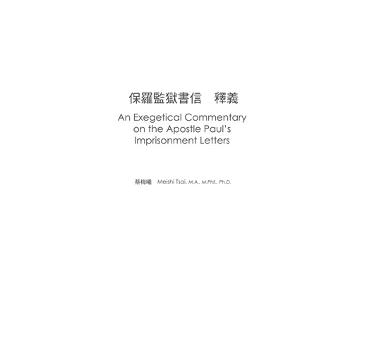 細品保羅的經歷和書信內容,真如同主耶穌所說的一句話,祂說:「凡文士受教作天國的門徒,就像一個家主,從他庫裡拿出新舊的東西來。」(太十三52)。透過保羅闡明舊約律法在新約主恩典上的完成,教導我們活學活用福音的真理。蔡梅曦傳道獻身服事主多年,常奉差派負責海內外各項宣牧工作,並在文宣、神學教育等事工盡心出力;聖工繁忙之際,亦潛心研經,善用其文學涵養與寫作恩賜,效法保羅立志以正意分解神的道,著作成書分享心得。今雖已不在第一線服事,然退而不休,仍研經不輟以助宣牧事工。本書闡述保羅「監獄書信」之要義,言簡意賅,發人省思,一如以往之著作,俾使研讀學道者,助益良多。願神記念帶領,彼此均得造就,主裡蒙福。