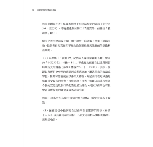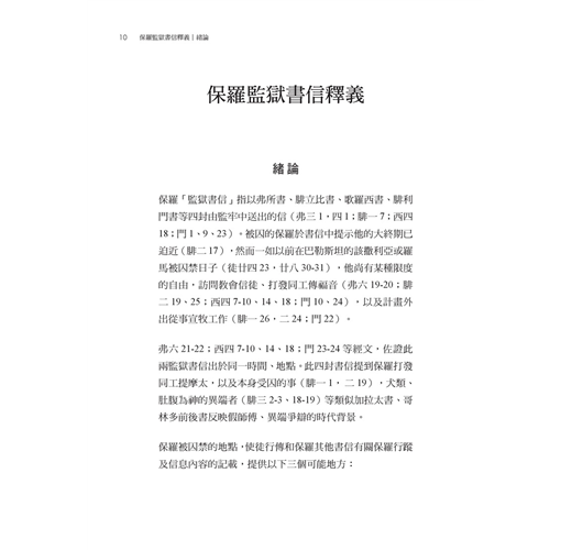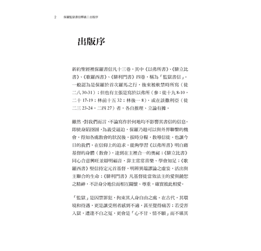 保羅晚年受囚時期書寫的四封「監獄書信」,由同工信差使帶給小亞細亞、希臘的以弗所、腓立比、歌羅西等地,以及一個奴隸主人腓利門,闡述至要的救贖論、教會論,同時也傳達他對會眾信望愛的實質長進,教會如何處理內外危機,以及如何善待一個叛離卻歸主的奴隸之代禱、祈求,期望。如此充滿歷史及神學意義的信息,對於今日掌握得救要道,追求屬靈知識,致力道德修養的人們,誠然具有相當的鼓舞、引導作用。