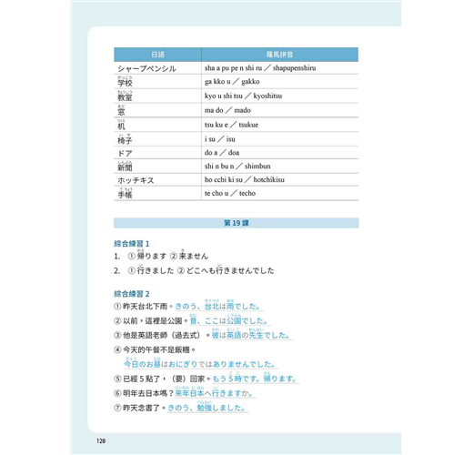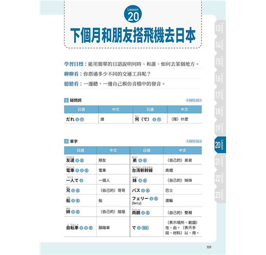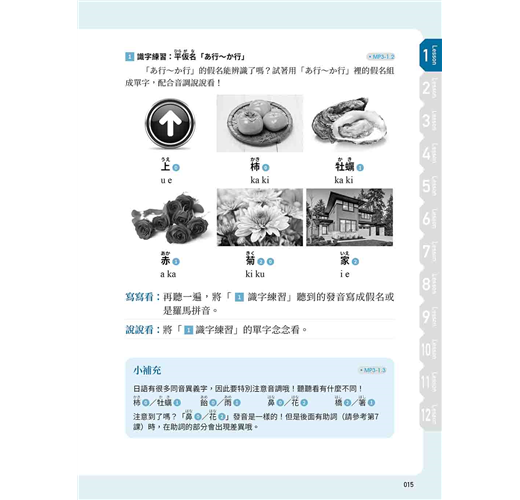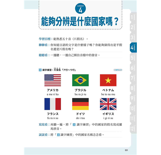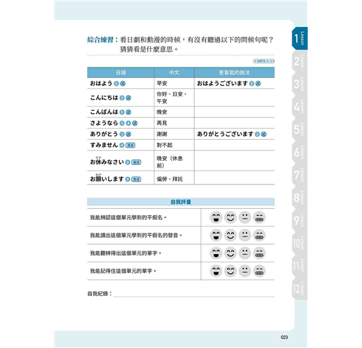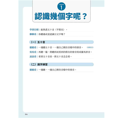 每一課的主題內容皆以「學習目標」→「聊聊看」→「聽聽看」→「寫寫看」→「說說看」→「綜合練習」→「自我評量」的方式來學習日語,日語不但聽、說、讀、寫一把抓,反覆練習及自我檢測,更能加深學習印象,打好日語基礎!