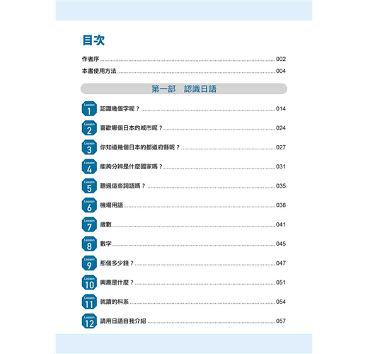 本書分為兩大部分,第一部為「認識日語」,針對完全沒有學習過日語的學習者編寫,從認識五十音的平假名、片假名開始,結合圖片的輔助以及認識日本的都市名稱,學習五十音不再枯燥無味。接著進入學習「機場用語」、「數字」、「興趣」等等,能順暢自如地開口用日語自我介紹,就是與日本人溝通無礙的第一步!