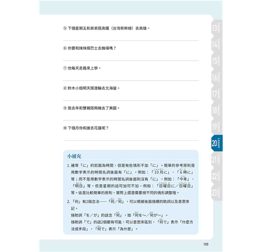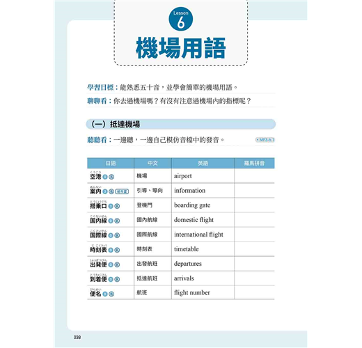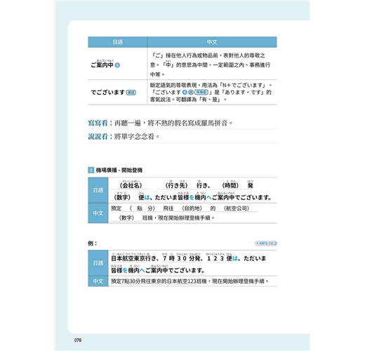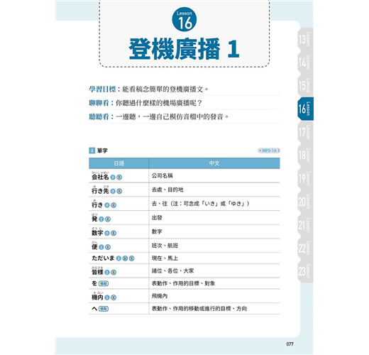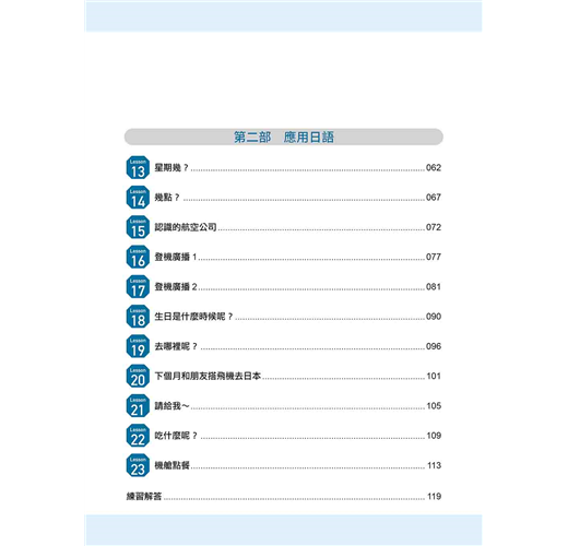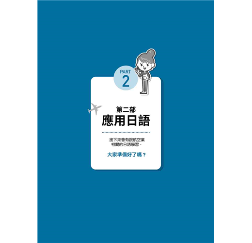 第二部為「應用日語」,除了進階學習詢問時間及加入簡單的句型用法之外,也同時學習於航空業就業或至日本旅遊時會實際用到的主題內容,像是「登機廣播」、「機艙點餐」等等,讓您在學習基礎日語的同時,也可以延伸學習航空、旅遊的相關基礎日語。